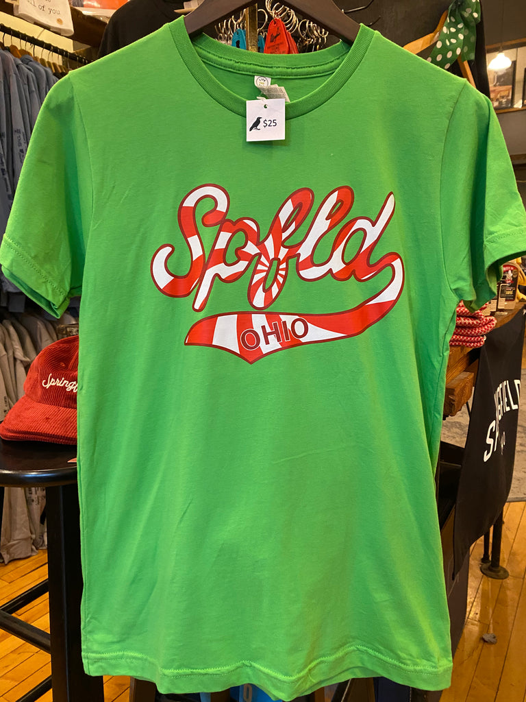 Perfect for the holidays a bright green t-shirt with candy cane lettering
