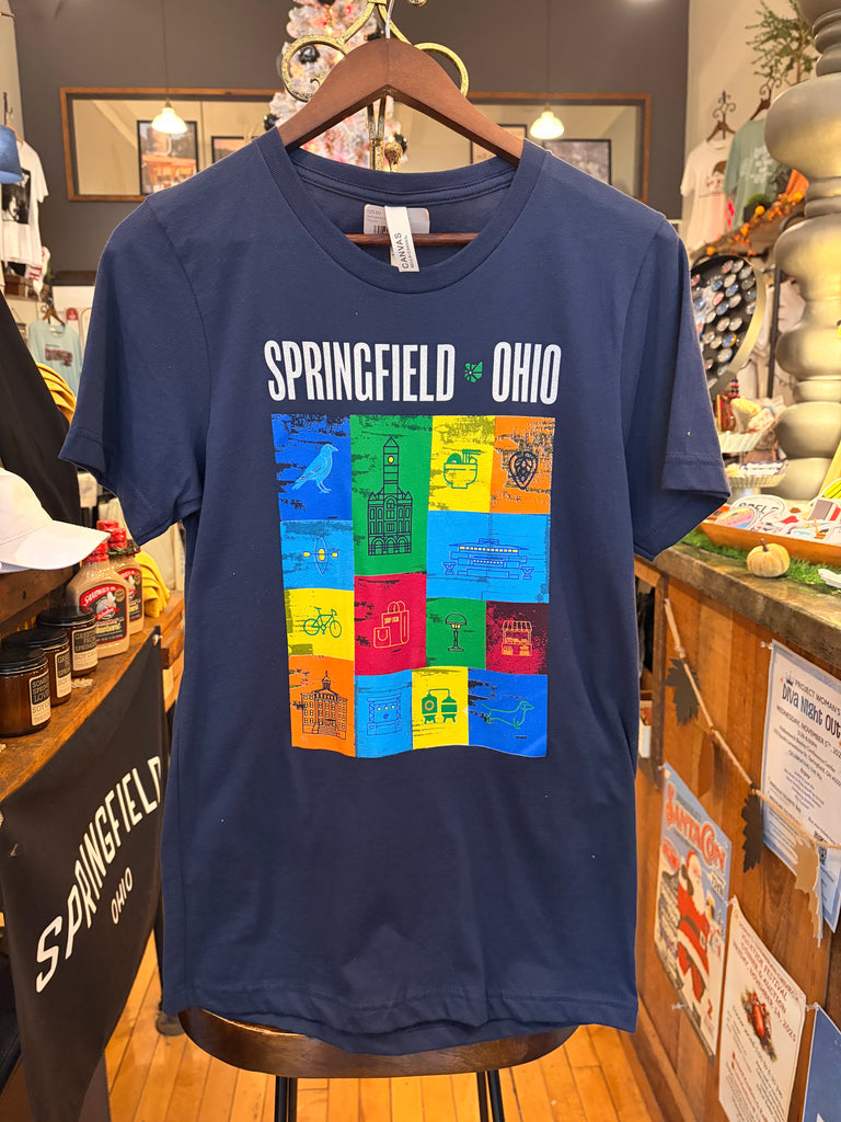 Super comfortable Bella+Canvas T-Shirt in Navy with a multicolored design of Springfield's unofficial mascots