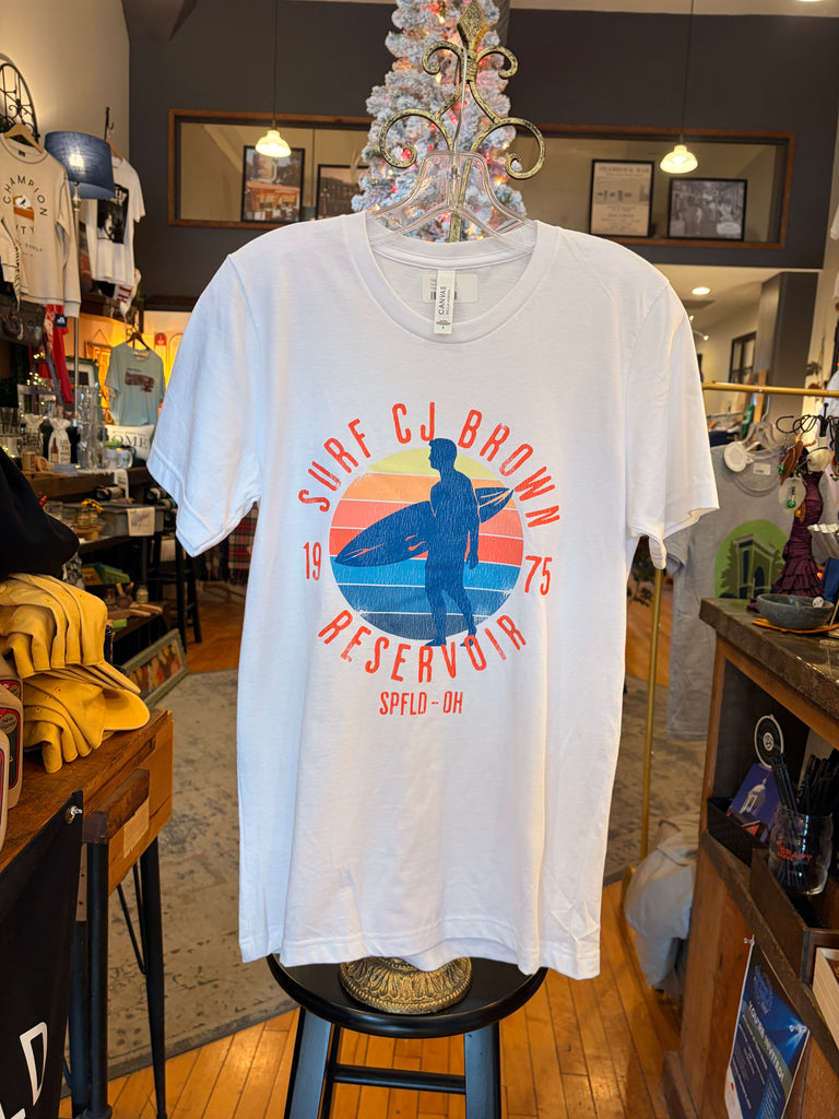 Super comfortable Bella+Canvas T-Shirt in White with a surfer and design in yellow, oranges, and blues for the Resevoir