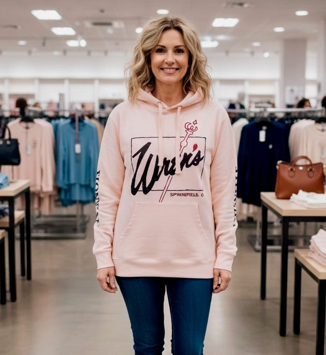 Light and super cozy MV Sport hooded long sleeve in light Pink with Black and Deep Red print