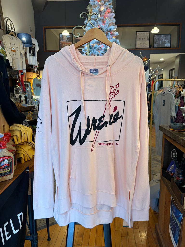 Ultra-lightweight Hooded Long-sleeve T-shirt by MV Sport in Light Pink with "Wren's" in Red and Black writing